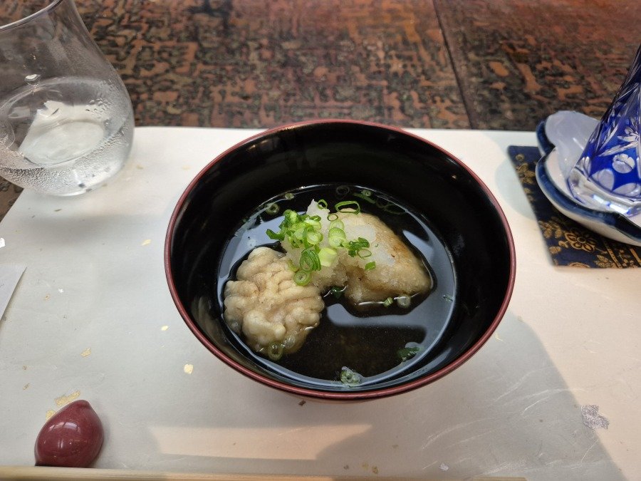 대구의 정소를 튀겨서 국물과 곁들어 내었습니다. 입에 넣는 순간 퍼지는 크리미함이 참 좋죠.
