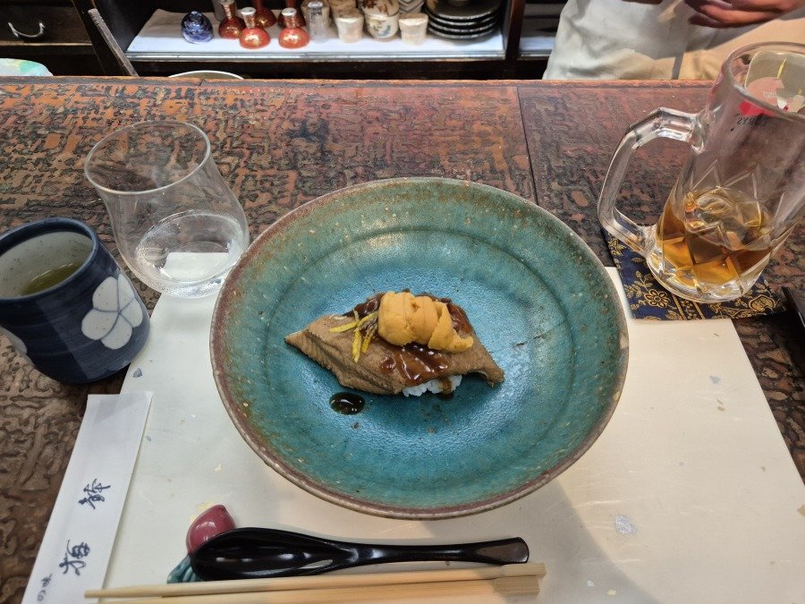 초밥을 만들어서 그 위에 엄청난 크기의 아나고(붕장어)와 북해도산 성게알을 올려줍니다. 맛이 없을리가 없죠.