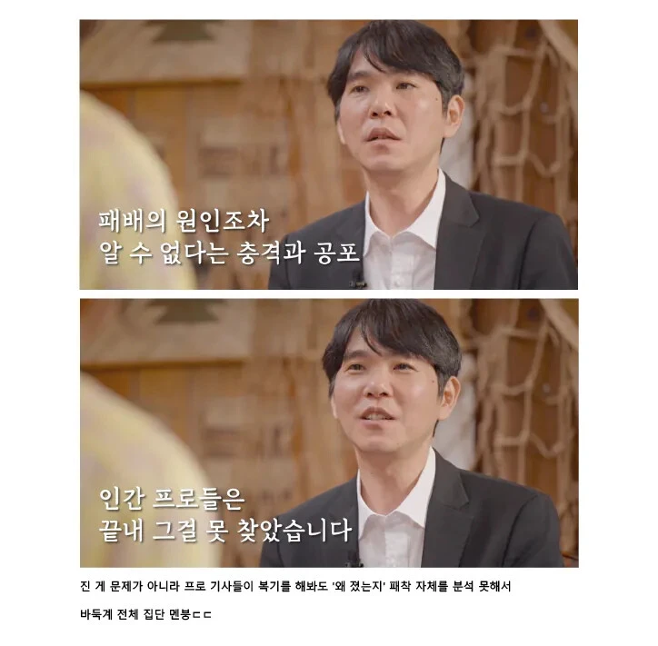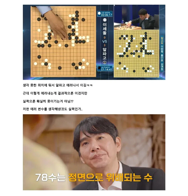 이거 보고 느낀게 바둑 AI 는 걍 철권핵같은거 같더라… 철권도 고티어 갈수록 중단,하단 이지를 걸지, 막히면 카운터 맞지만 성공하면 큰 콤보를 넣을수 있는 어퍼를 지를지 나름 수싸움,심리전이 크게 적용 되는데 걍 가드핵, 카운터 핵으로 상대한다면 리플봐도 답없고 상대법을 모르는 상태에서 이게 철권의 미래다!! 하면현타 올듯…