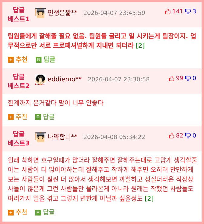 팀원들이 너무하네.. 팀장도 팀장 역할 제대로 못하는거 같고..